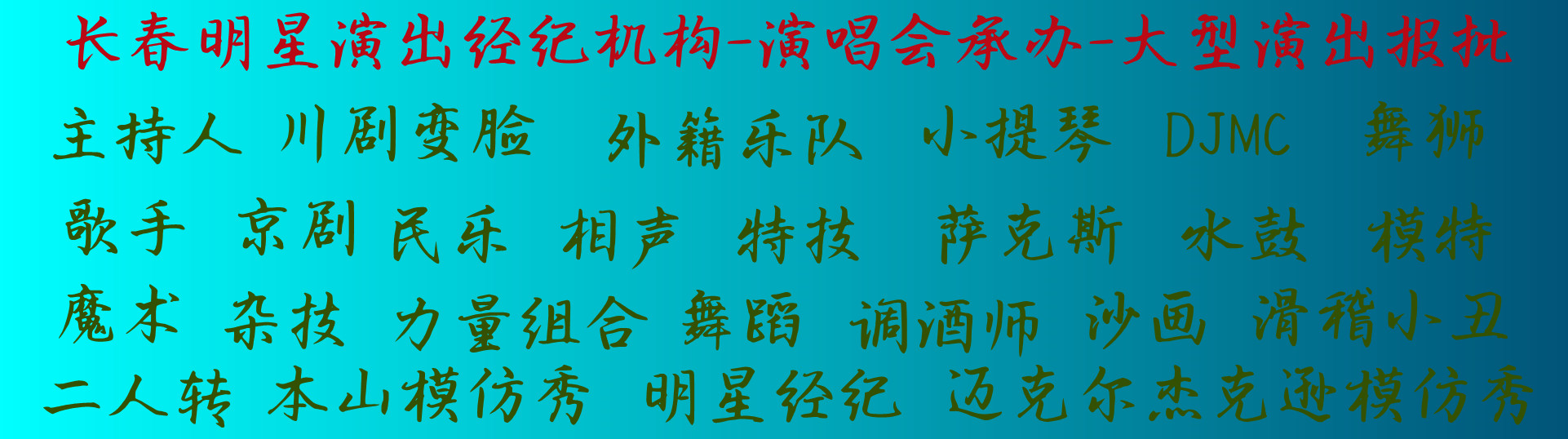 長春演出公司-承接中大型演出策劃執(zhí)行,企業(yè)年會演出,校慶廠慶演出,公司開業(yè)演出,明星經(jīng)紀演出,晚會,發(fā)布會,答謝會演出,音樂節(jié),啤酒節(jié)演出。